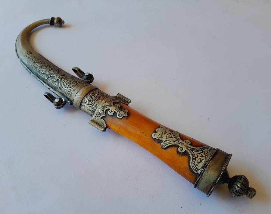 An early to mid 20th Century Moroccan curved dagger with engraved blade and bone handle. Original intricately decorated metal scabbard. In excellent condition. Please view images above for more detail.