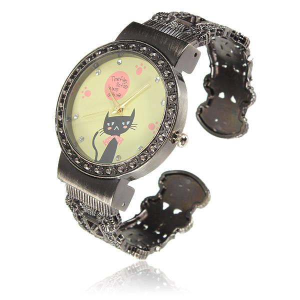 Vintage Mustache Cat Bicycle Flower Bangle Women Opening Watch