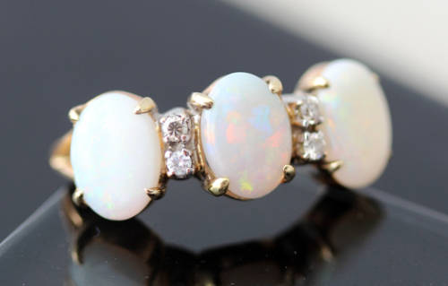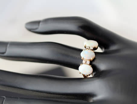 This gorgeous vintage piece features 3 large oval natural opals totalling 2.34 carats, claw set in 9ct yellow gold. The 8mm x 6mm glowing iridescent cabochons are separated by 4 x brilliant cut diamonds, 2 each on either side of the central opal. The 21mm wide x 8mm long ring head sits on a slender 9ct yellow gold shank, and rises 3mm above the finger. The shank forks horizontally on the shoulders, creating an openwork triangle on either side of the ring head. The claws are quite long and curving, being both decorative and functional. The ring bears the jeweller's signature, weighs a solid 3 grams, and is in good condition. I have had the ring appraised and certified by an independent jeweller, and his valuation of R13'000.00 will accompany the piece. It is a particularly lovely opal ring with definite 'collectable' appeal.