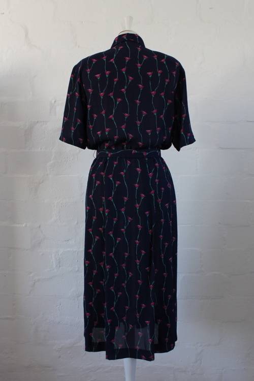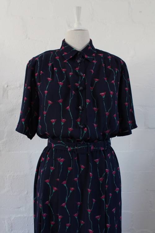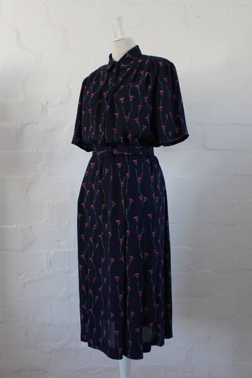 VINTAGE NAVY BLUE PINK FLORAL PRINT BELTED DAY DRESS - SIZE 12