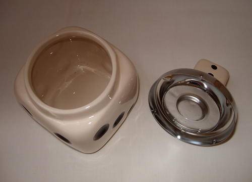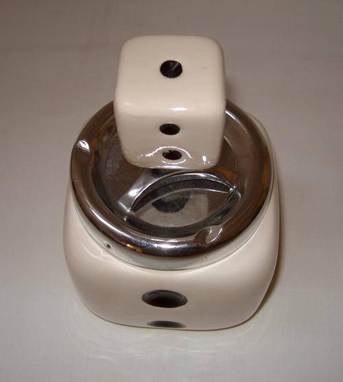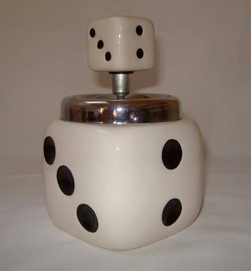 An ivory and black glazed ceramic revolving push button ashtray in the form of two dice.