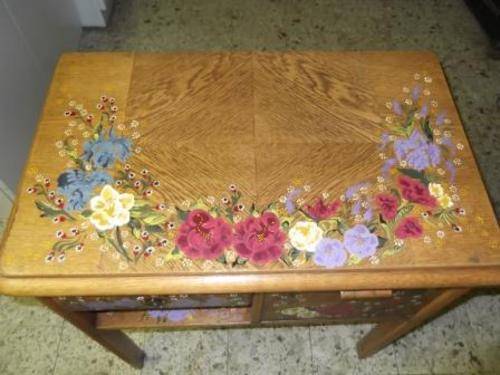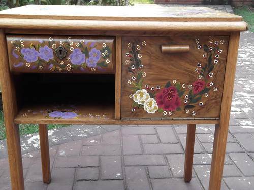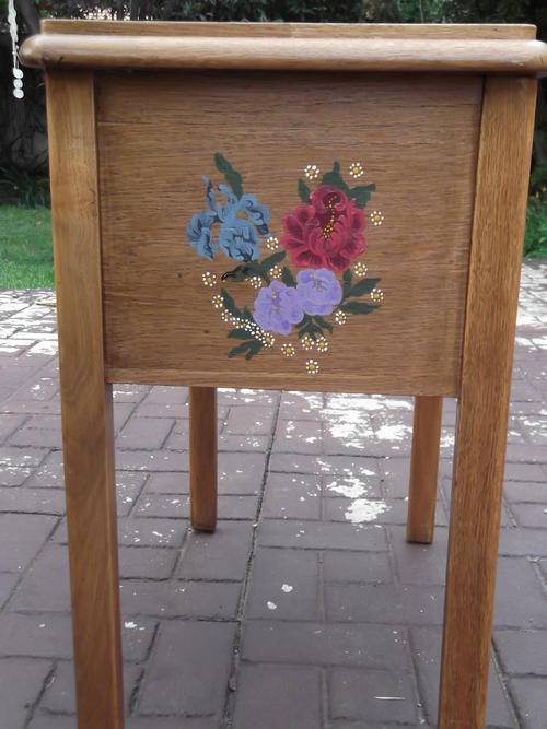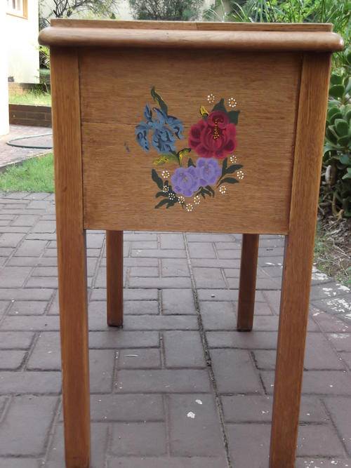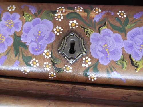 THIS HAS TO BE THE MOST UNIQUE PIECE THAT I HAVE SEEN IN A LONG TIME. THIS CABINET HAS THE MOST BEAUTIFUL ARTWORK PAINTED WITH VIBRANT COLOURS. THE TOP OF CABINET HAS THE CENTRE PIECE INLAID WITH OAK PANELS WITH THE GRAIN OF THE WOOD INLAID INTO A DIAMOND SHAPE. THERE IS ONE DRAWER WITH COMPARTMENTS INSIDE. THE BIG DOOR OPENS DOWNWARDS, THIS IS MADE OF A DIFFERENT WOOD (HAVE NO CLUE AS TO WHAT IT IS) WHICH COMPLEMENTS THE OAK PERFECTLY.