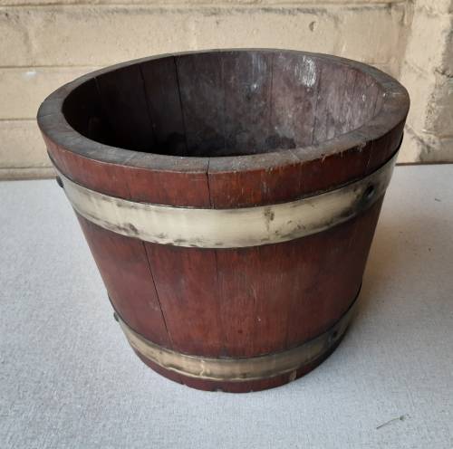 VINTAGE OAK WINE BARREL PLANT POT HOLDER WITH BRASS HOOPS. IT IS IN A GOOD CONDITION WITH A VERY SMALL CHIPTO THE TOP RIM (SEE PICS). IT MEASURES 23 CM IN HEIGHT AND THE TOP IS 28.5 AND THE BOTTOM 24 CM IN DIAMETER RESPECTIVELY