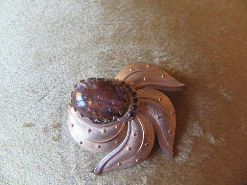 Vintage Opal Style Stone brooch with tiny stones around one side of large stone gold tone pin intact.