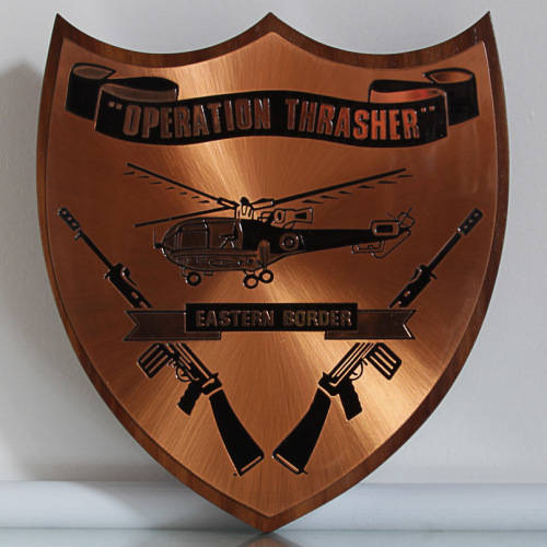 VINTAGE - "OPERATION THRASHER" EASTERN BORDER COPPER ON WOOD PLAQUE - RHODESIA