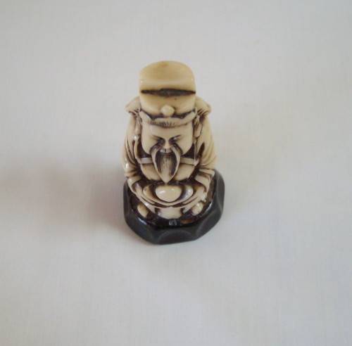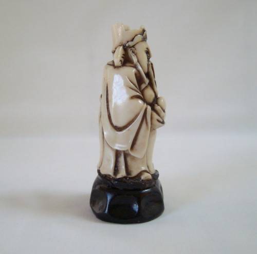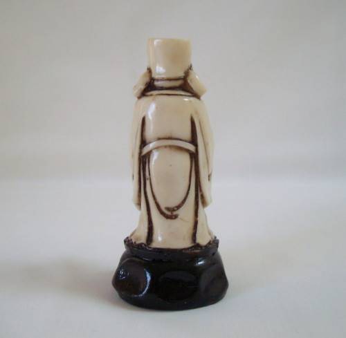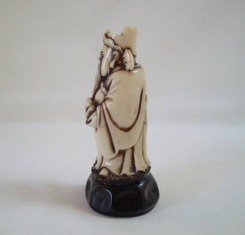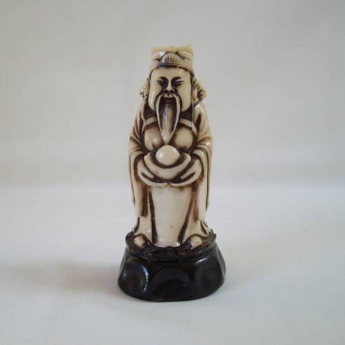 A cast composite resin faux ivory figurine of an Oriental man holding a bowl,