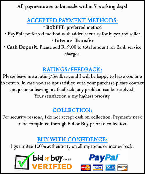 R35.00 Standard shipping using one of our trusted couriers applies to most areas in South Africa. Some areas may attract a R30.00 surcharge. This will be calculated at checkout if applicable.
