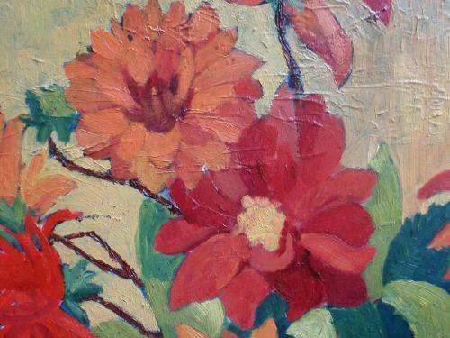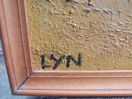VINTAGE: FABULOUS ORIGINAL OIL ON MASONITE by LYN GILBERT - SIGNED LYN & DATED 1960. THIS IS A VERY EARLY PAINTING BY THIS ARTIST - LOVE THE POST IMPRESSIONIST 'VAN GOGH' STYLE STILL LIFE. LYN GILBERT'S LATER WORKS ARE VERY INTERESTING AVANT GARDE PIECES. PAINTING AND FRAME ARE IN GOOD CONDITION. SIZE: 74CM X 64CM (TOTAL SIZE INCLUDING FRAME OF 2.5CM IN WIDTH)
