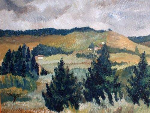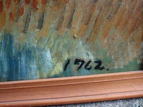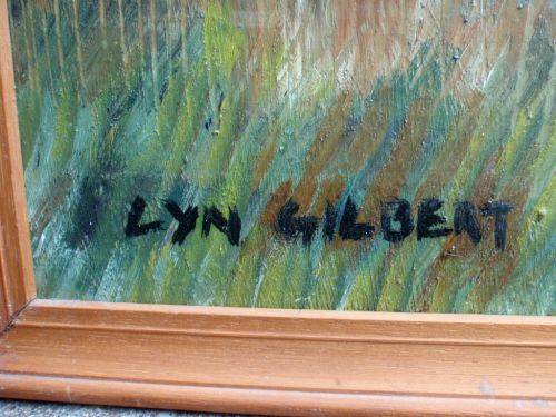 VINTAGE: ORIGINAL by LYN GILBERT, CIRCA 1962. FABULOUS EARLY WORK BY THIS ARTIST - POST IMPRESSIONIST STYLE. LYN GILBERT'S LATER WORKS ARE VERY AVANT GARDE. OIL ON MASONITE IN NARROW WOOD FRAME. SIZE: 64CM X 64CM (TOTAL SIZE INCLUDING FRAME OF 2.5CM IN WIDTH) PAINTING AND FRAME IN GOOD CONDITION.
