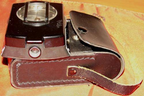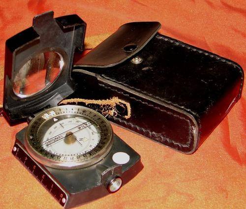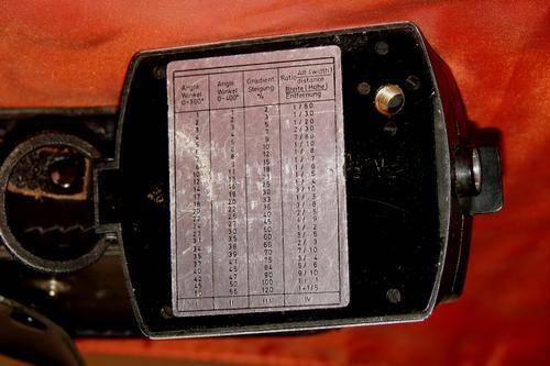Inclination meter with percentage and gradient scale. Conversion tables for mils/degrees. Percentage/gradient and width distance (sticker black and white on back). Material of case and lid black metal