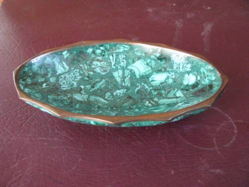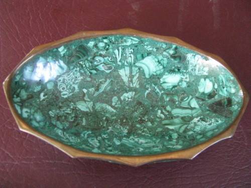 A VINTAGE MALACHITE AND BRASS OVAL BOWL