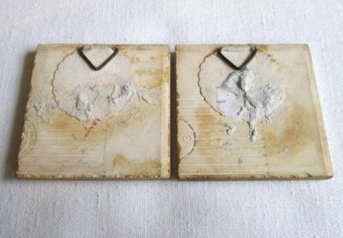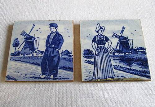 A lovely pair of miniature blue and white unmarked Delft tiles, with windmill, man and lady. size 5.2 cm x 5.2 cm.