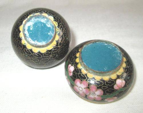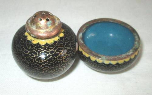 Vintage pair of Peach Blossom Cloisonne Salts. This lovely set consists of an open salt ( 4.4 cm in diameter, 2 cm high ) and a shaker ( 4.5 cm high ). Both are decorated in beautiful peach blossoms.