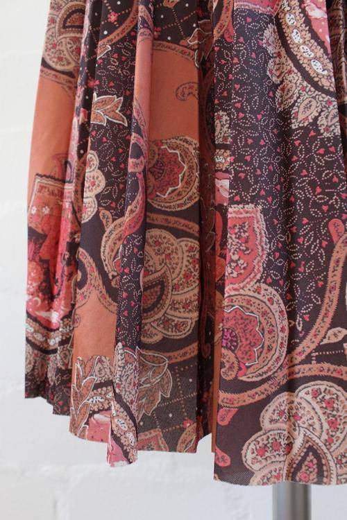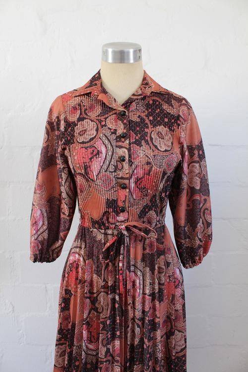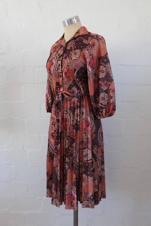 VINTAGE PAISLEY FLORAL PRINT BROWN PLEATED DRESS - SIZE 8