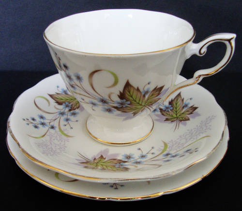 VINTAGE PARAGON BY APPOINTMENT TO HER MAJESTY THE QUEEN TRIO - FOOTED CUP, SAUCER AND TEA/SIDE PLATE "ANGELIQUE" FINE BONE CHINA ENGLAND CIRCA 1956 - BLUE FLORAL WITH GILT TRIM.