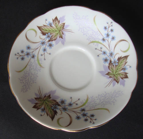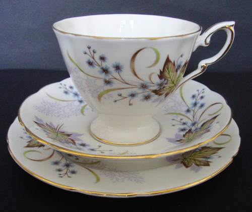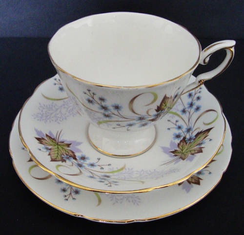 VINTAGE PARAGON BY APPOINTMENT TO HER MAJESTY THE QUEEN TRIO - FOOTED CUP, SAUCER AND TEA/SIDE PLATE "ANGELIQUE" FINE BONE CHINA ENGLAND CIRCA 1956 BLUE FLORAL WITH GILT TRIM.