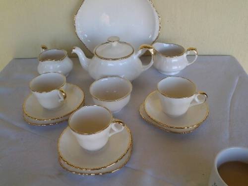 stunning part vintage white and gold grindely cream petal tea set items consist of a tea pot , cake plate three stunning tea cup trios one milk and sugar bowl with extra milk jug all items are in good used condition all for one bid