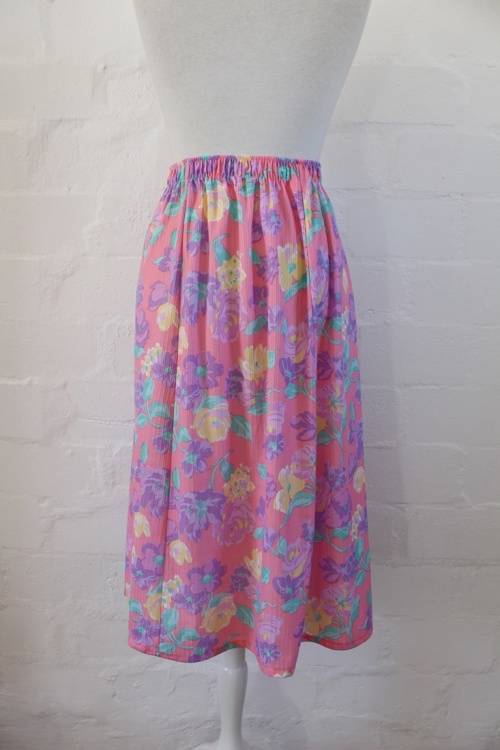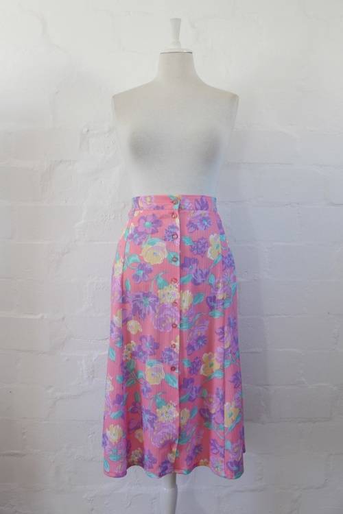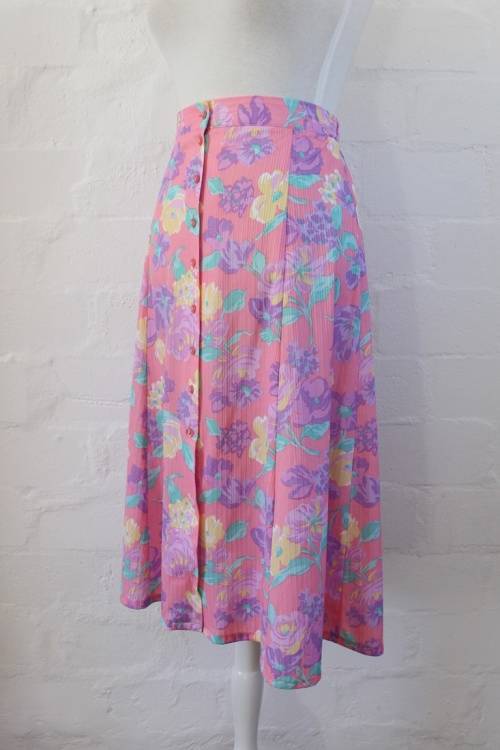 VINTAGE PASTEL PINK FLORAL PRINT HIGH WAIST BUTTON DOWN SKIRT - SIZE 14