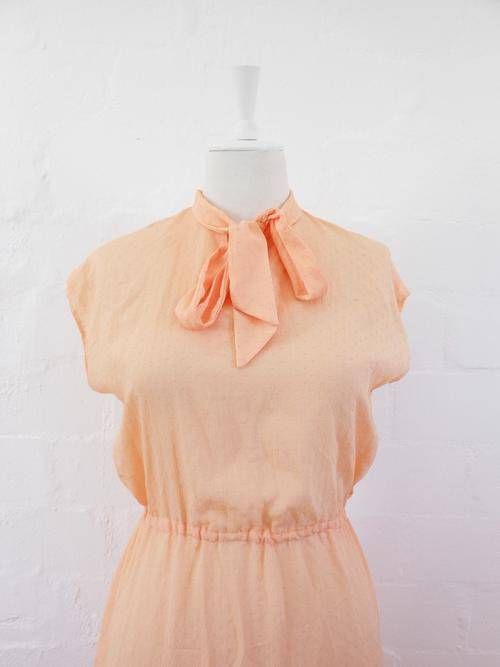 Lovely authentic vintage polka dot embroidered dress with pussybow tie at neck. Elasticated at waist. Hand made. Very good condition, with a small area of wear on front near side (see close-up). Size 12/ 36.