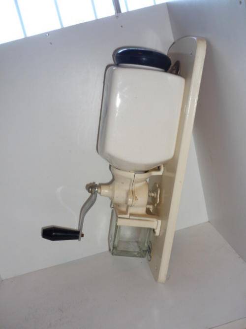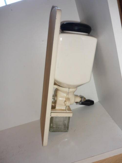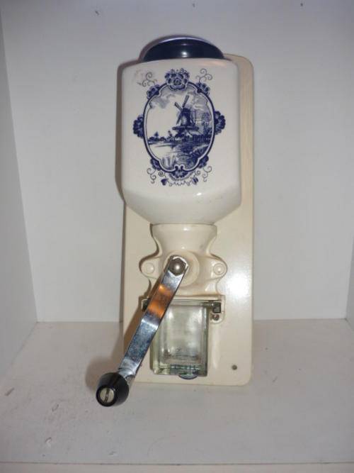 This grinder is made of porcelain and wood with a dutch motif and is in working condition,The glass coffee hopper also is in good condition.