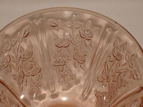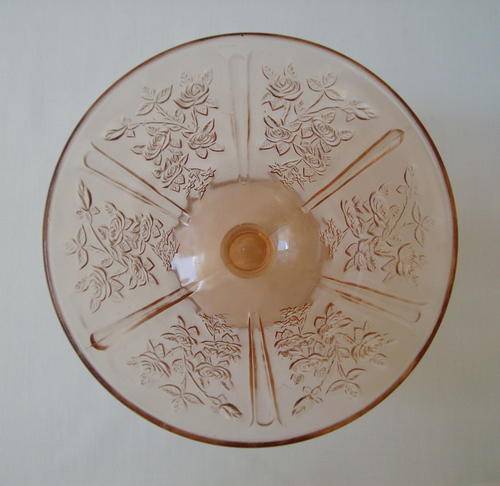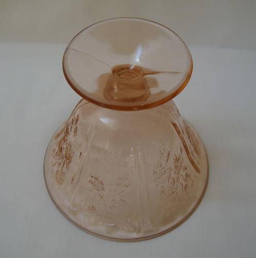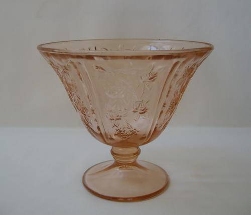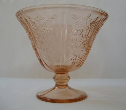 An American Art Deco era peach pink pressed glass pedestal bowl in the Sharon