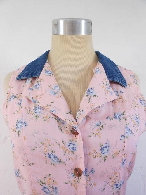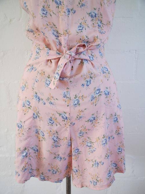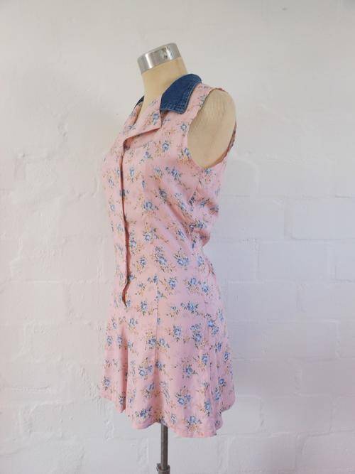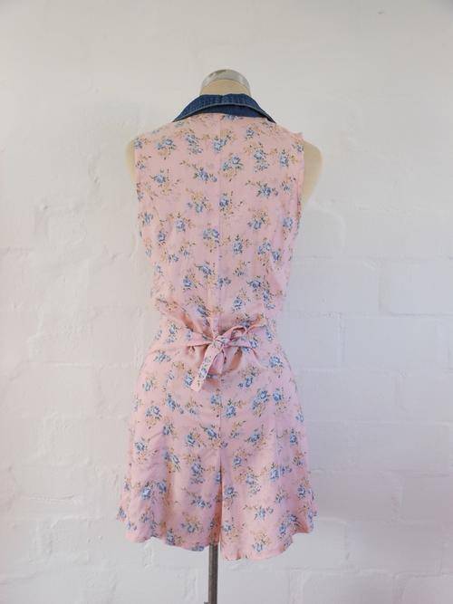 VINTAGE PINK FLORAL PRINT DENIM COLLAR SHORT PLAYSUIT ROMPER ONE PIECE - SIZE 8