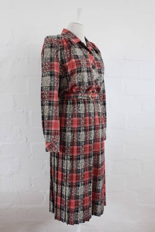 VINTAGE PLAID CHECK PRINT PLEATED BELTED LONG SLEEVE DRESS - SIZE 14