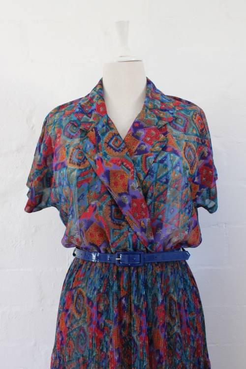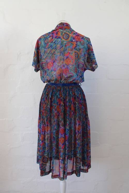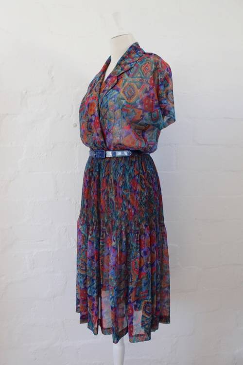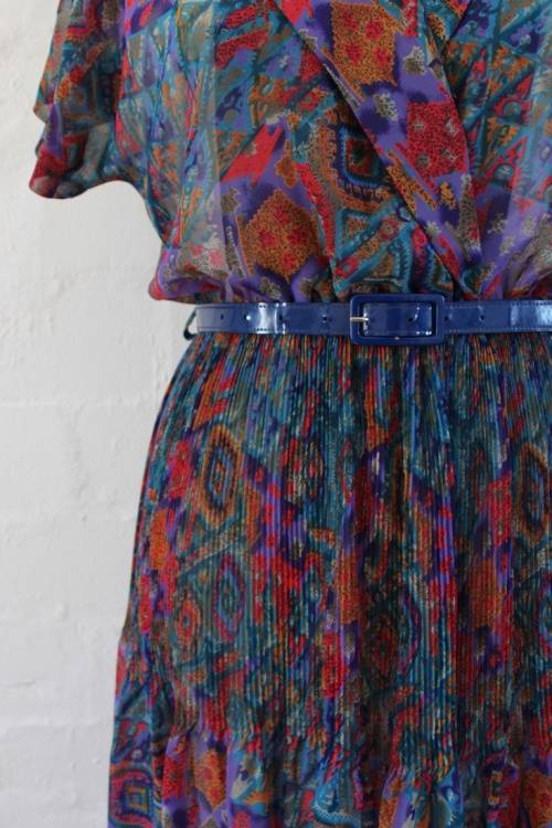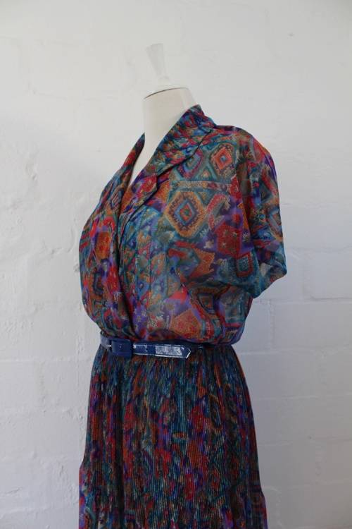 VINTAGE PLEATED RED BLUE PRINTED BELTED DAY DRESS - SIZE 12