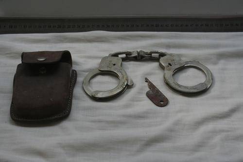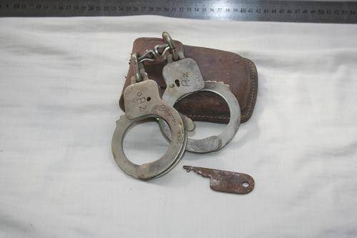 VINTAGE POLICE STEEL HAND CUFFS IN ORIGINAL LEATHER POUCH WITH KEY!