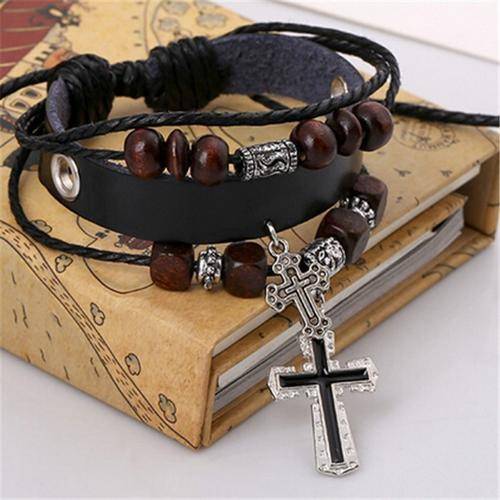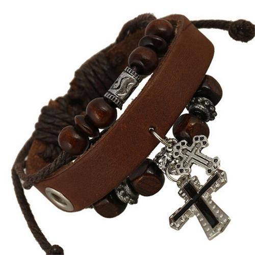 Vintage Punk Wood Beads Bracelets Multilayer Cross Pendant Rope Leather Bracelets