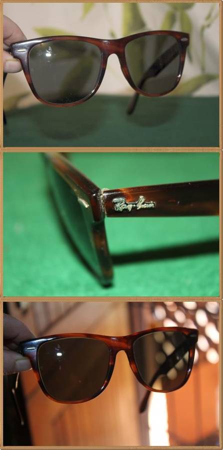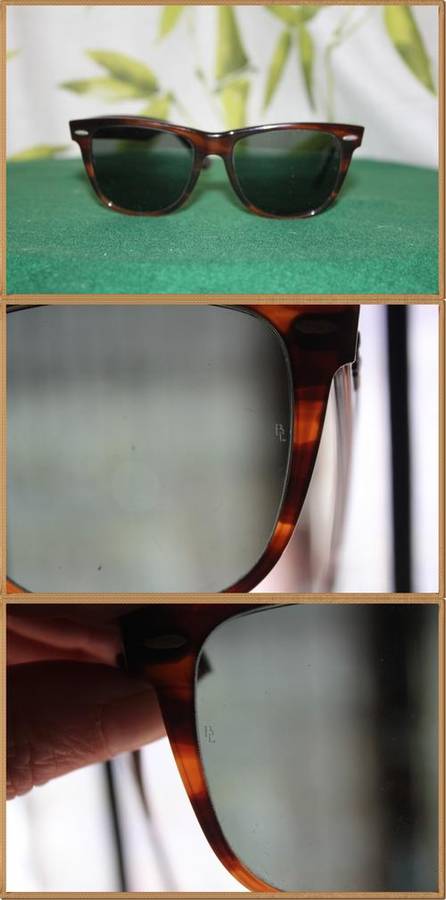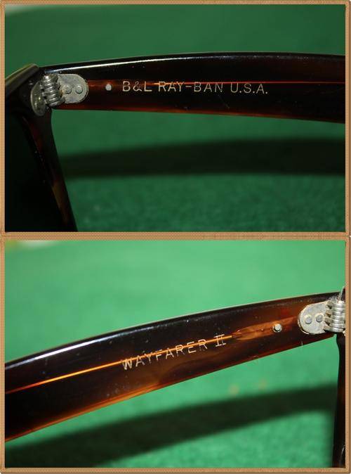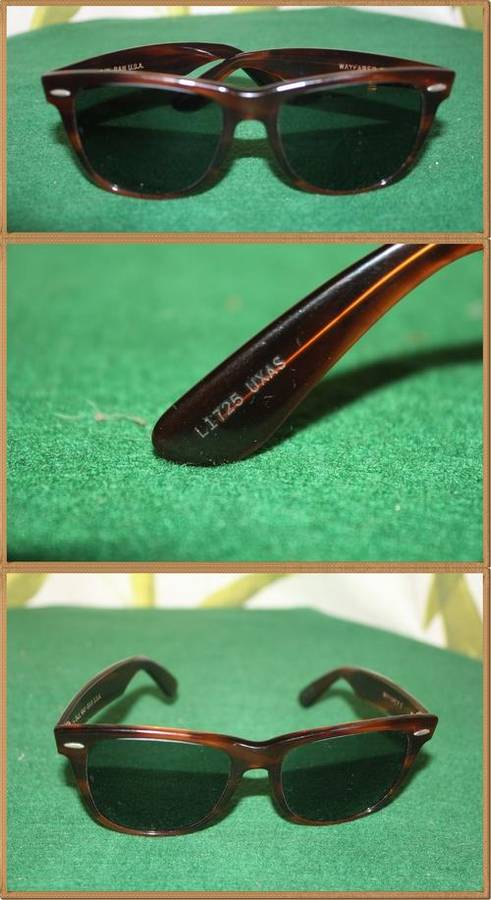 MADE IN THE USA BAUSCH & LOMB WAYFARER II SIZED FRAMES WITH GREYISH GREENISH GLASS LENSES WHICH ARE ETCHED WITH BL AT EACH SIDE. MARKED B&L RAY-BAN USA AND WAYFARER II INSIDE THE ARMS. RAY BAN IN RELIEF AT THE HINGES. CODE LI725 UXAS ON EAR PIECE