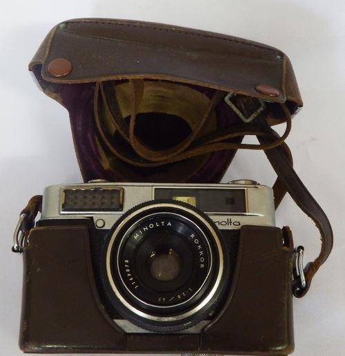 Minolta uniomat vintage camera with Rokkor 1:2.8 lens in leather pouch - as per photo