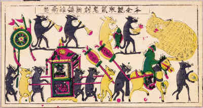 Cat agrees right away. They choose a lucky date, the 7th night of the New Year, as their wedding day. The rats carry the bride in a bright red sedan chair, all the way beating gongs and drums.