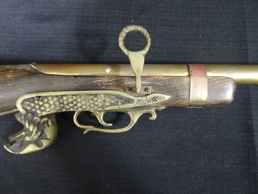 59cm x 9cm. This is a very large and heavy item with two beautiful brass mounting brackets. The pistol is marked made in England, but not very clearly, on the barrel there is a brass strip with England and a number 931991 the rest of the inscription has rubbed of threw the years. This is a lovely item for a bar or man cave.