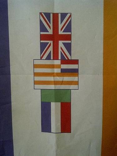 The old South African flag, with the orange, white and blue horizontal stripes and the three smaller flags in the center representing the four provinces that constituted South Africa at the time.