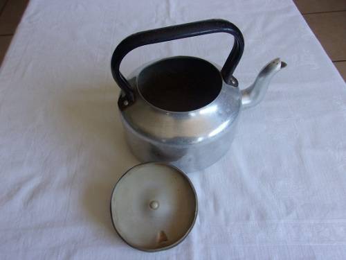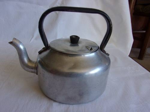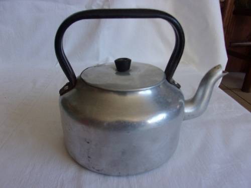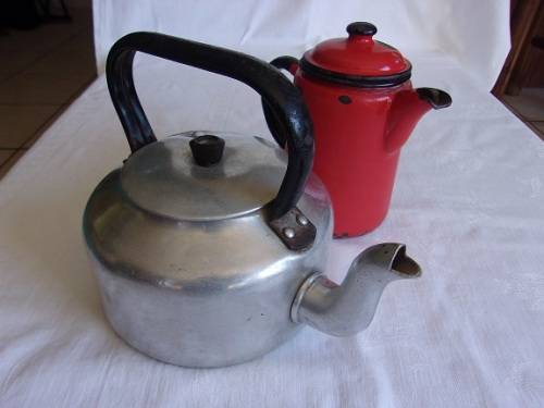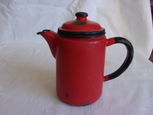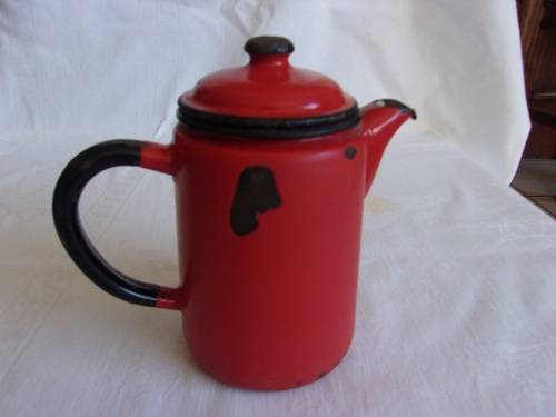 Vintage retro orange & black enamel coffee pot & small stove top kettle. I would date this lovely little coffee pot and kettle to the 1950/60s, and they would have been used on the stove top or on a fire. The coffee pot is orange and black enamel on the outside, and white on the inside. It stands 16cm (h) x 18cm (w from spout to handle). The kettle is aluminium with a bakelite lid knob. It measures 14cm (h to top of handle) x 21cm (w to tip of spout). It holds about 1L of water. The coffee pot and kettle have some age wear - kettle has calcium build up, but this adds to their character. Great buy for your vintage kitchen - 1 bi for both.
