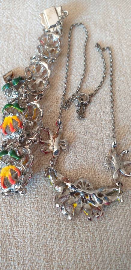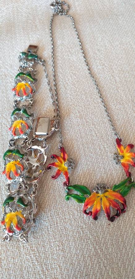 Here is a lovely set of Rhodesian rhodium plated and enamel flame lily necklace and bracelet set in excellent condition. The necklace measures approx 42cm long and the bracelet is approx 18cm long. Shipping via SAPO (at buyer's risk) R65.00 OR Postnet R110.00. Payment within 3 days after close of auction. Thanks for looking
