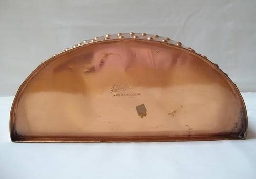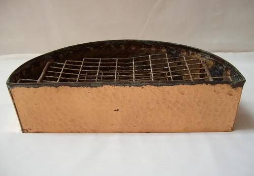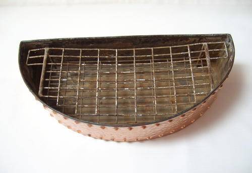 A hammered copper half moon flower trough, with double layer wire grid insert.