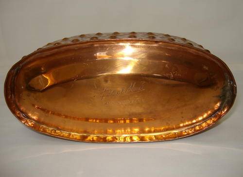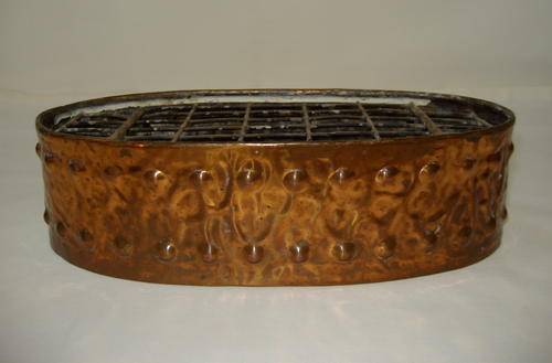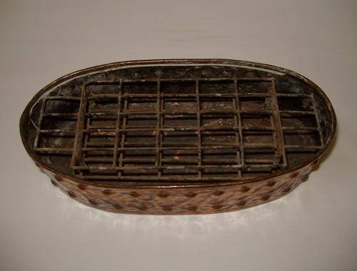 A hammered copper oval flower trough, with double layer wire mesh grid insert.
