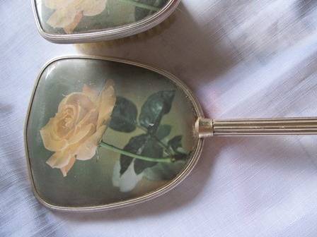 Vintage Rose Dressing Table set consisting of a hand held mirror and brush.