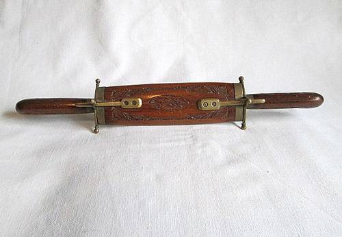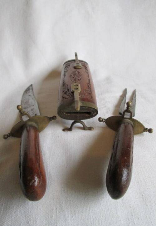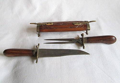 A lovely vintage rose wood and brass ornate footed carving set. Handles and stand made of profusely carved rose wood. Wonderful intricate and finely details. In good unpolished condition, total length of 37 cm, knife 24,5 cm, fork 22 cm.