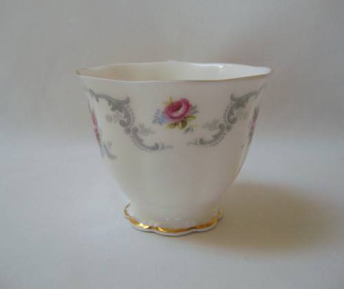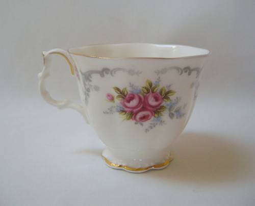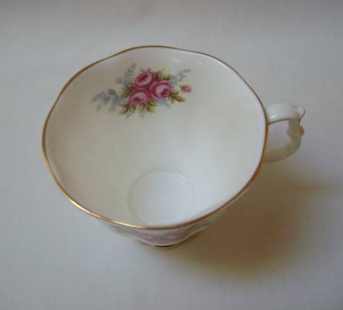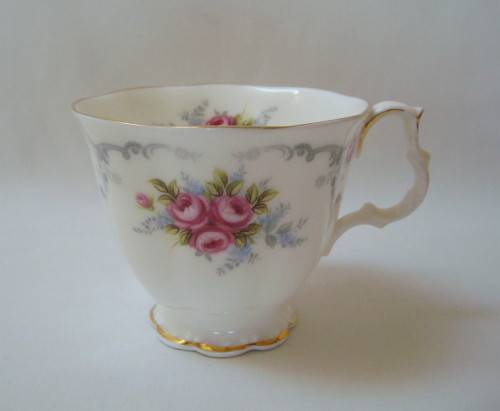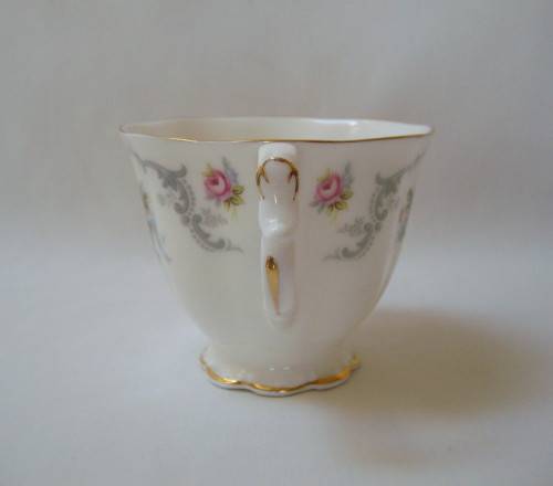 roses, blue flowers, green leaves and grey scrolls, gilt edged rim and ear detail.