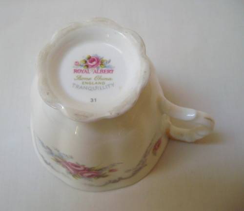 A white glazed bone china tea cup, decorated with transfer-printed sprays of pink
