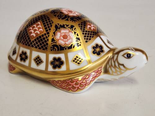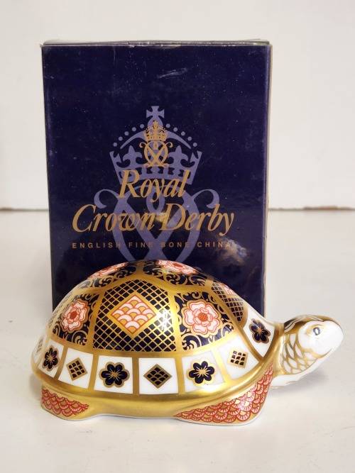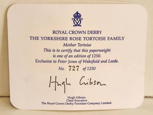 GREAT FIND! BOXED VINTAGE ROYAL CROWN DERBY BONE CHINA MOTHER TORTOISE OF THE YORKSHIRE ROSE TORTOISE FAMILY PAPERWEIGHT FIGURINE. THIS ARTEFACT IS LIMITED EDITION NO 727 OF 1250 DESIGNED EXCLUSIVE TO PETER JONES OF WAKEFIELD AND LEEDS AND SIGNED BY HUGH GIBSON, CHIEF EXECUTIVE OF THE ROYAL CROWN DERBY PORCELAIN COMPANY. IT IS IN EXCELLENT CONDITION WITH NO CHIPS OR CRACKS OR ANY LOSS OF THE GILT FEATURES AND MEASURES 12 CM LONG, 7 CM WIDE AND IN DIAMETER AND 2.8 CM HIGH.