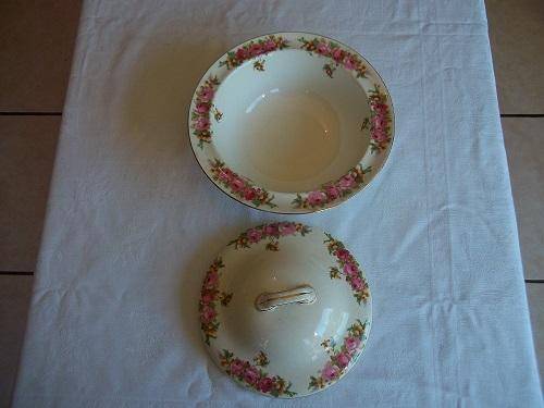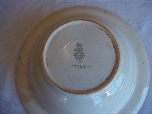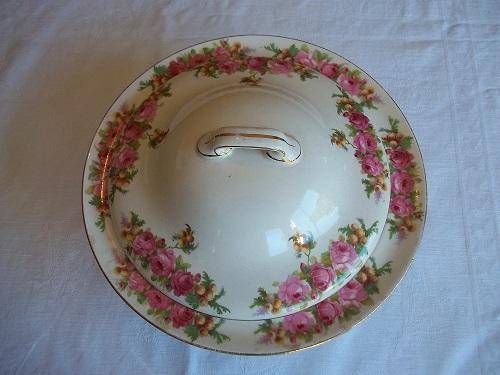 Royal Doulton Roses & Wattle lidded vegetable tureen (1). This great old pattern was one of many designed by Royal Doulton expressly for the Australian market. The D5643 pattern number dates it to 1936. The lidded vegetable tureen measures 24cm in diameter and 8cm deep. The tureen in good condition - no chips or cracks. A lovely old item that would proudly adorn any dinner table.