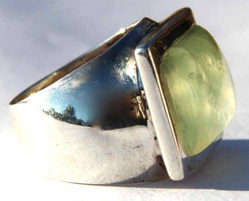 This stunning vintage ring is from Russia. We had the ring assessed as the unusual inclusions visible inside the natural green amethyst caught our attention. It is a "lint amethyst" - very unusual! The gemstone is set in very heavy 925 sterling silver and the whole thing weighs in at just over 14 grams.