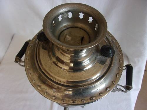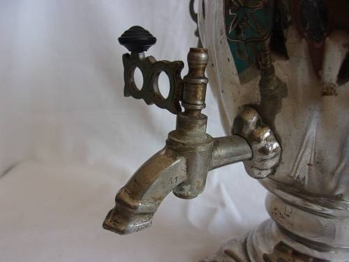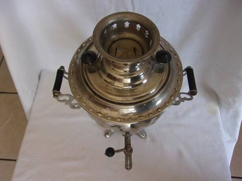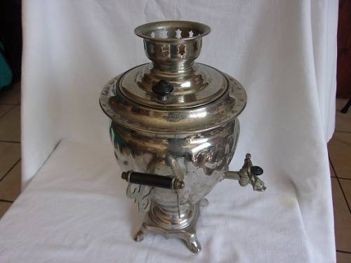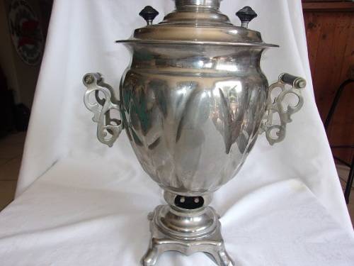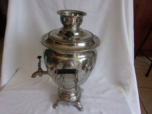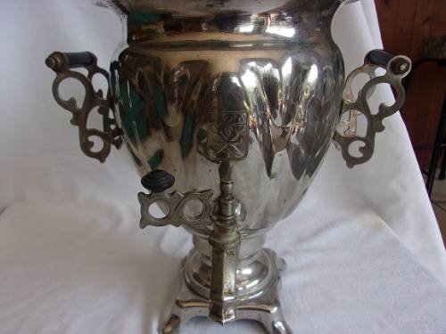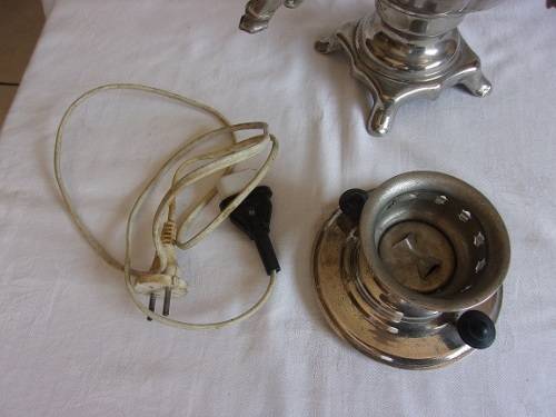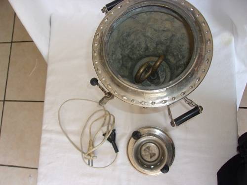 Vintage Russian (USSR) Tula silver plated electric samovar. From the official government on the bottom, this samovar can be dated to 1982 . It is beautifully designed out of silver plate, with scrolled handles and bakelite grips and knobs. It holds about 3L, and stands about 37cm high. The element works and it comes with its original 220v cord, but needs the bottom washer (seal) to be replaced. Lovely item for your vintage kitchen.