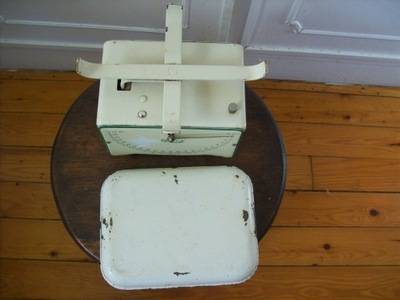 Vintage scale, marked in pounds; the scale is enamel, good working condition, the tray has chipping on it but this does not affect the use thereof. measures 210mm x 160mm x 170mm.Marked Lyssex patent Swiss made. Nice kitchenalia item.
