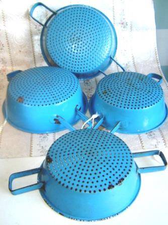 The chips that were strained are eaten, but there are chips in the enamelware colanders.
