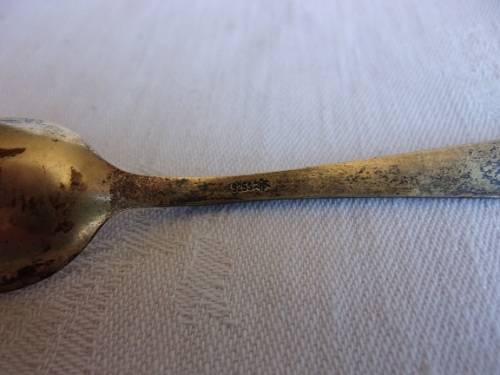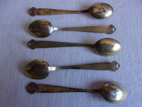 Vintage set of 5 Continental .925 silver (gilt) enameled teaspoons. I would assume that these teaspoons are Scandinavian in origin, and that they date to the 1950s. They are manufactured from gilded .926 silver with enameled shafts and enameled crown finials. They are hallmarked 925S with 2 slanted A's, and have been tested as .925 silver. They measure 9,5cm in length, and weigh a total of 45,6g. They are in fair condition - is some wear to the gilt and 1 teaspoon has wear to the enamel. Great buy.